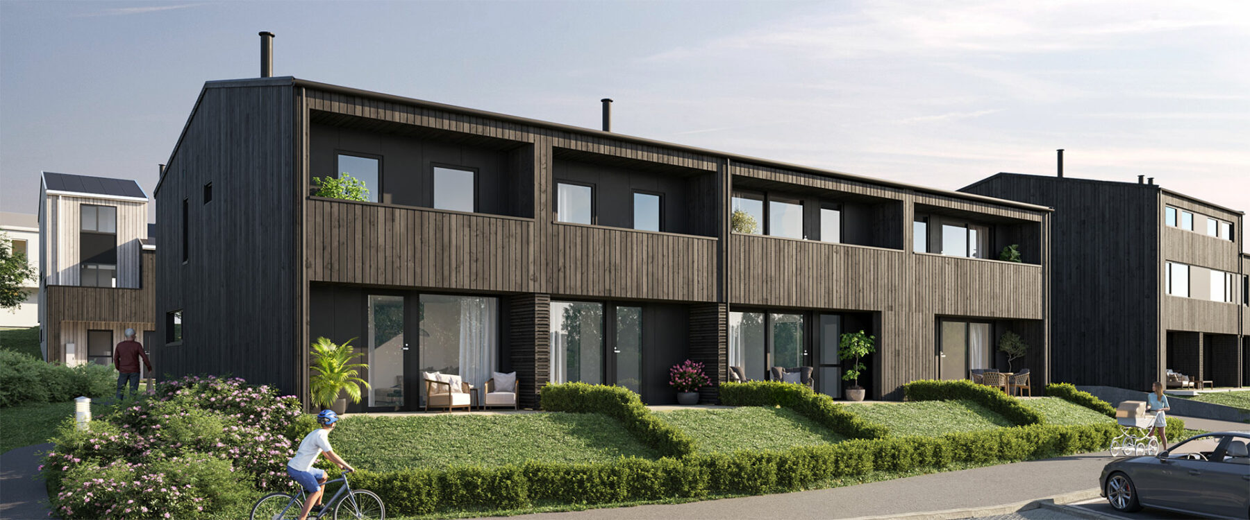 Vi skal bygge de 67 første boligene. De fordeler seg på ti delfelt. Seks med bare rekkehus, fire med en kombinasjon av rekkehus og leiligheter i lave flermannsboliger. Vi er på toppen av Hundvåg, og det er ikke behov for å rage til himmels. Størrelser vil variere fra leiligheter på ca. 57 m2 til rekkehus på ca. 149 m2 . Boligmiksen inviterer til mangfold blant beboerne: Barnefamilier med små og litt større barn,